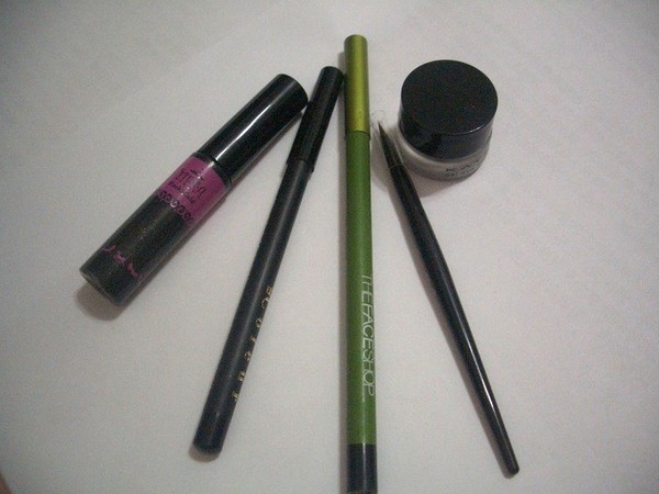 左到右:Tiffa黑色眼線液、英凱眼線筆、THE FACE SHOP眼線筆、KATE眼線膠BK-1
