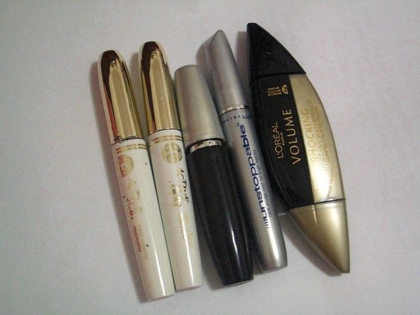 左到右:極太x2、Maybelline5倍舊款、超能延長睫毛膏、L'oreal12倍睫毛膏